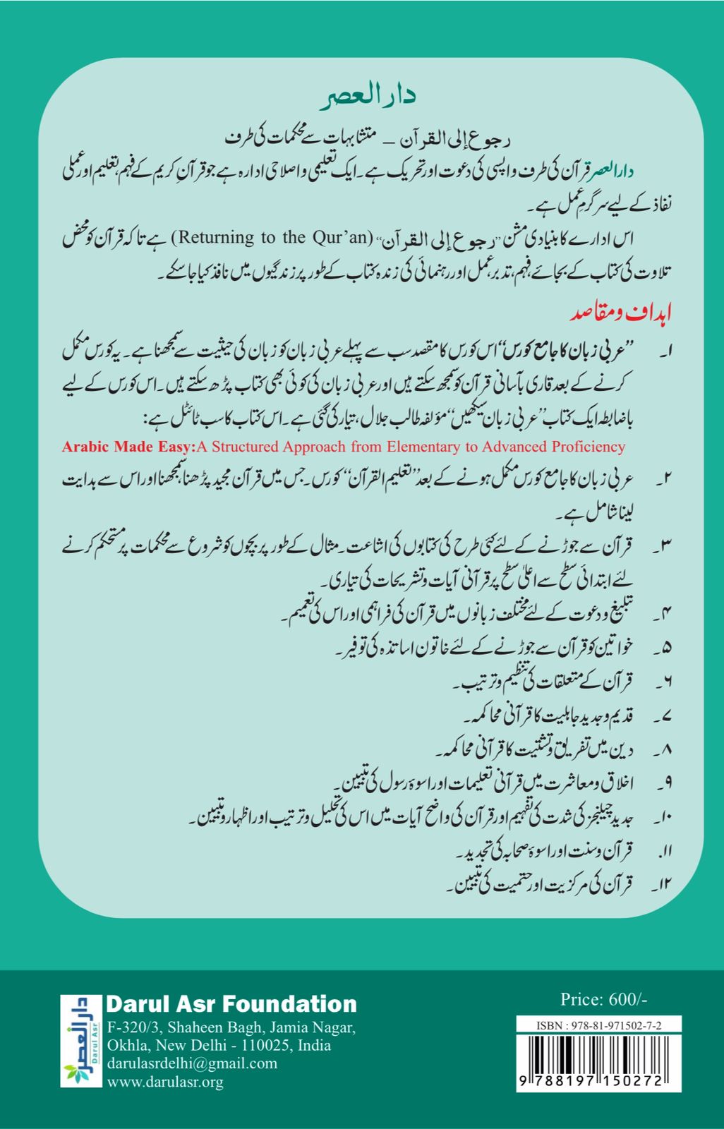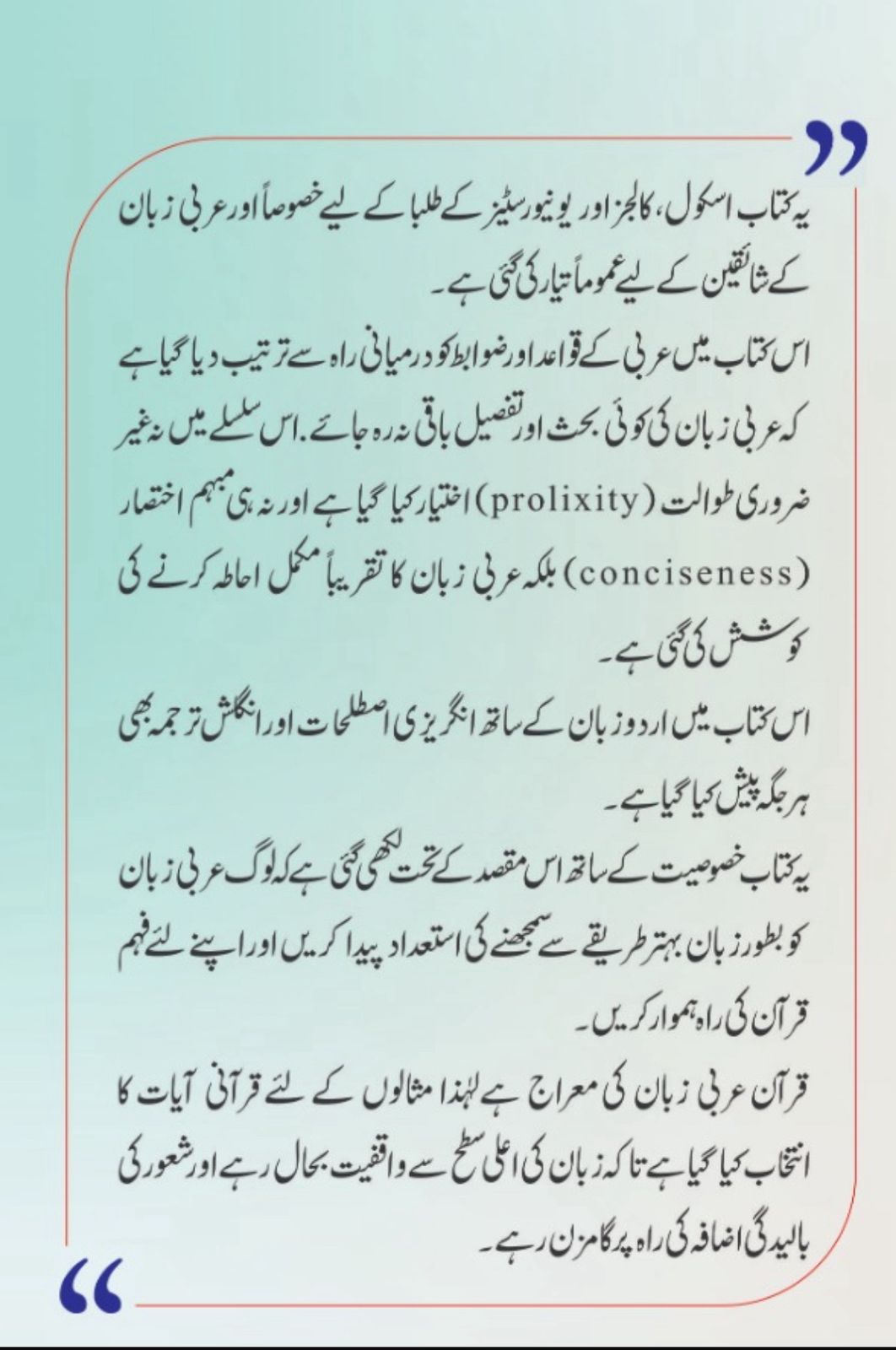 یہ کتاب عربی زبان کی تدریس میں ایک منفرد academic contribution ہے جو مدارس، کالجز، یونیورسٹیوں اور self-learners سب کے لیے یکساں مفید (universally beneficial) ہے۔ اس کا مقصد صرف عربی سکھانا نہیں بلکہ زبانِ قرآن کے فہم (comprehension) کی راہ ہموار کرنا ہے۔